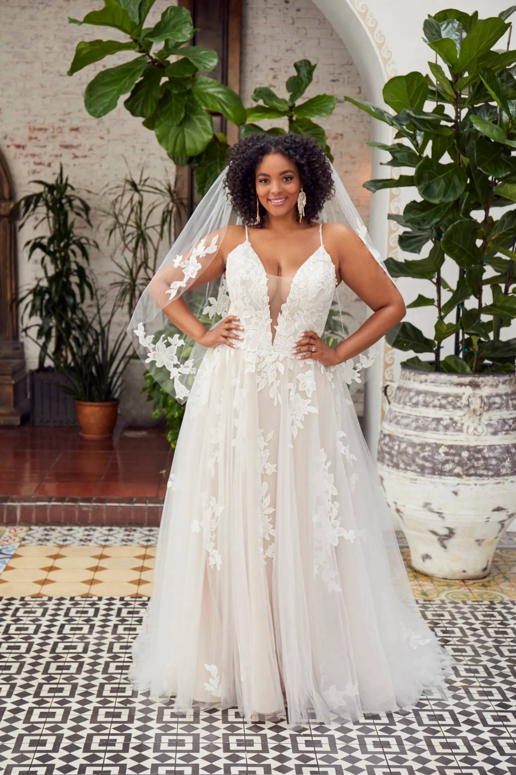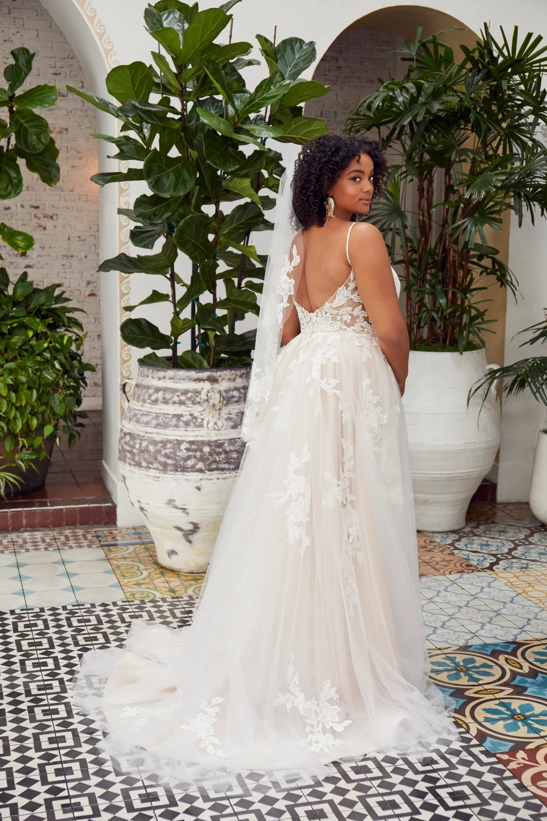 Dreamy BL354 is for the modern bride seeking a touch of natural charm. Detailed floral lace appliqués decorate the bodice, supported by classic spaghetti straps and a plunging V-neckline. V-cutouts on the sides of the bodice show a subtle amount of skin, complemented by a low V-back. The soft tulle skirt is ethereal as can be, lace appliqués interspersing throughout and cascading into a 65 inch train. An A-line silhouette is universally flattering, which means this affordable wedding dress will look flawless on every shape and size. A matching fingertip length veil, sold separately, is the perfect accessory to tie the look together.