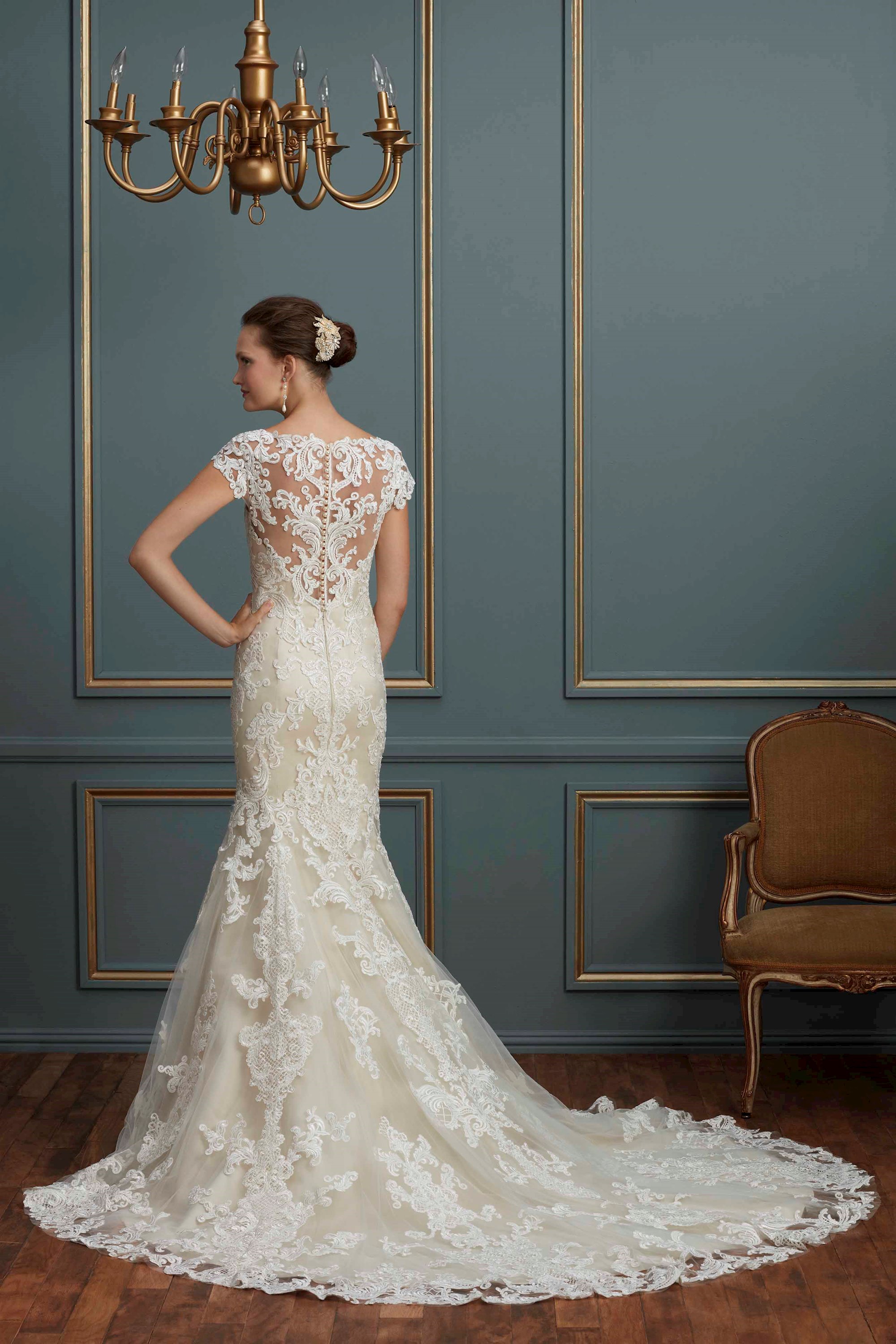 Lattice detail lace and tulle fit and flare silhouette with dramatic low V-neckline, cap sleeves and illusion back.