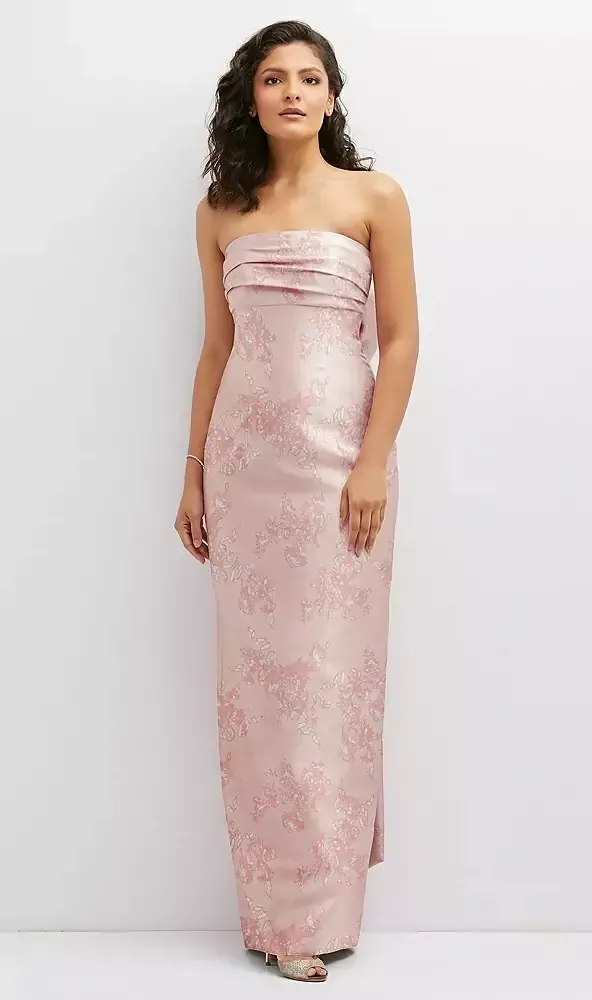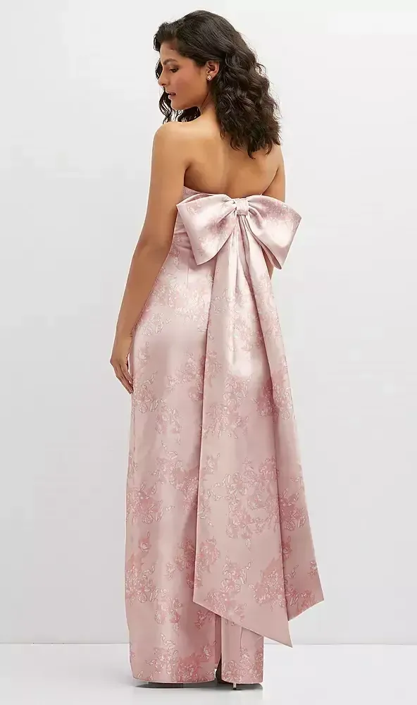Strapless with a mid-cut bodice, this glam maxi dress is an enticing choice for a bridal party. Form-fitted with a silhouette that flatters most figures, this Satin Twill floral dress offers a column design with a draped bodice. An oversized fixed back bow detail adds a dramatic look.