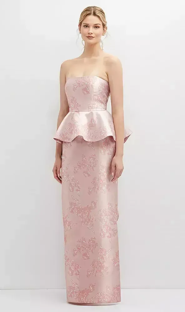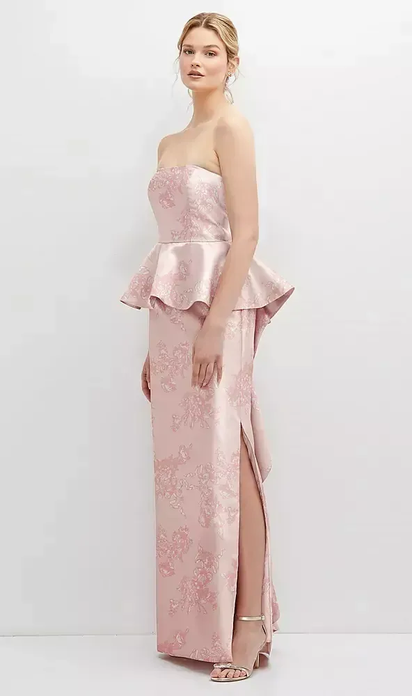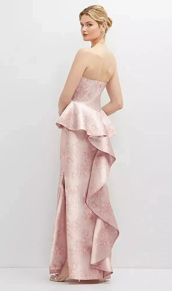 Romantic flowy style flatters most body types and becomes a must-have choice for outfitting a bridal party. This strapless Satin Twill print maxi dress offers a charming peplum detail with a ruffle panel gently cascading down its back. Move easily with a side slit that's both comfortable and alluring.