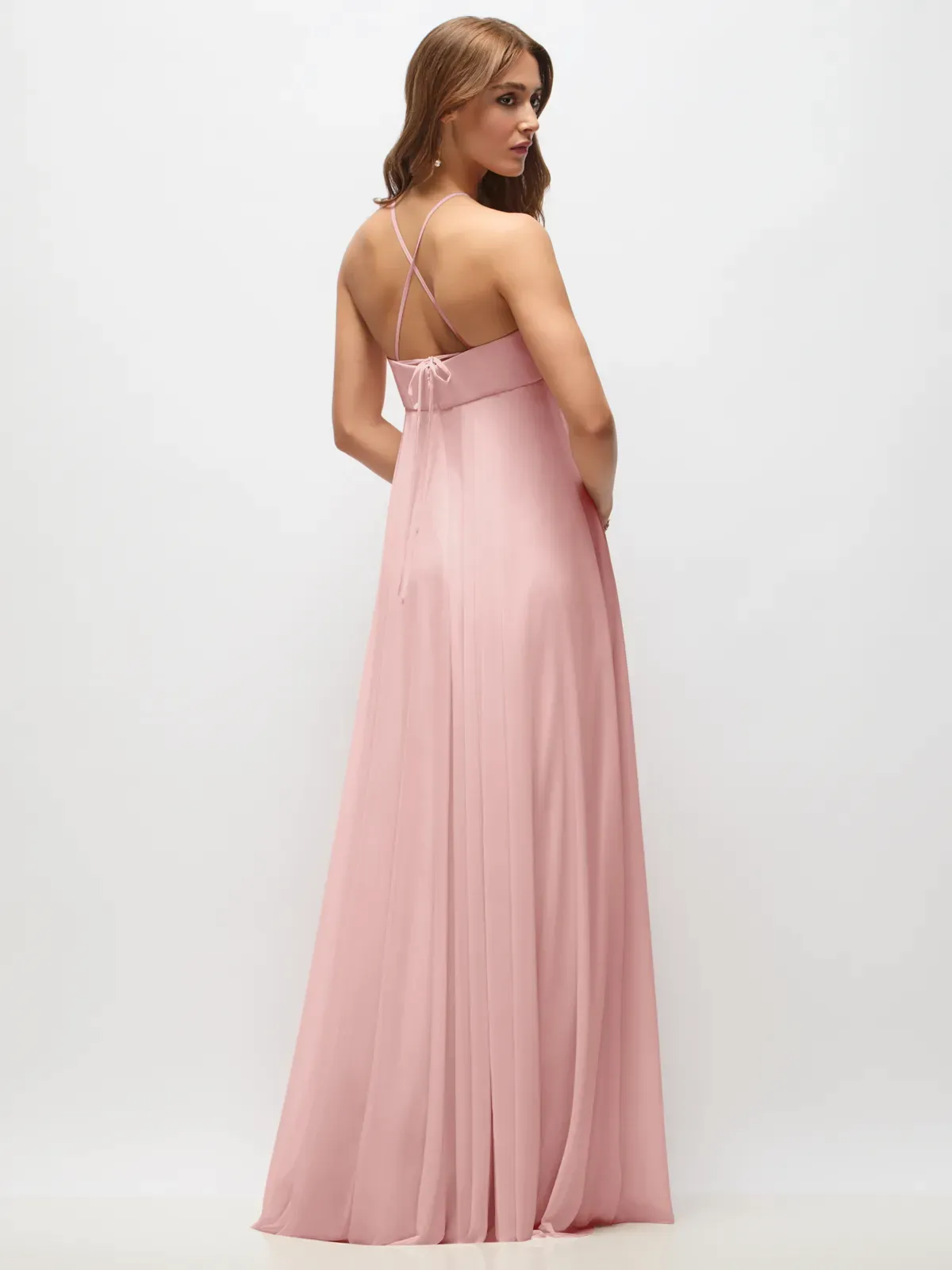 Full length empire waist Lux Chiffon halter dress with convertible spaghetti straps. U-wire with ruching at front bodice and airy circle skirt.