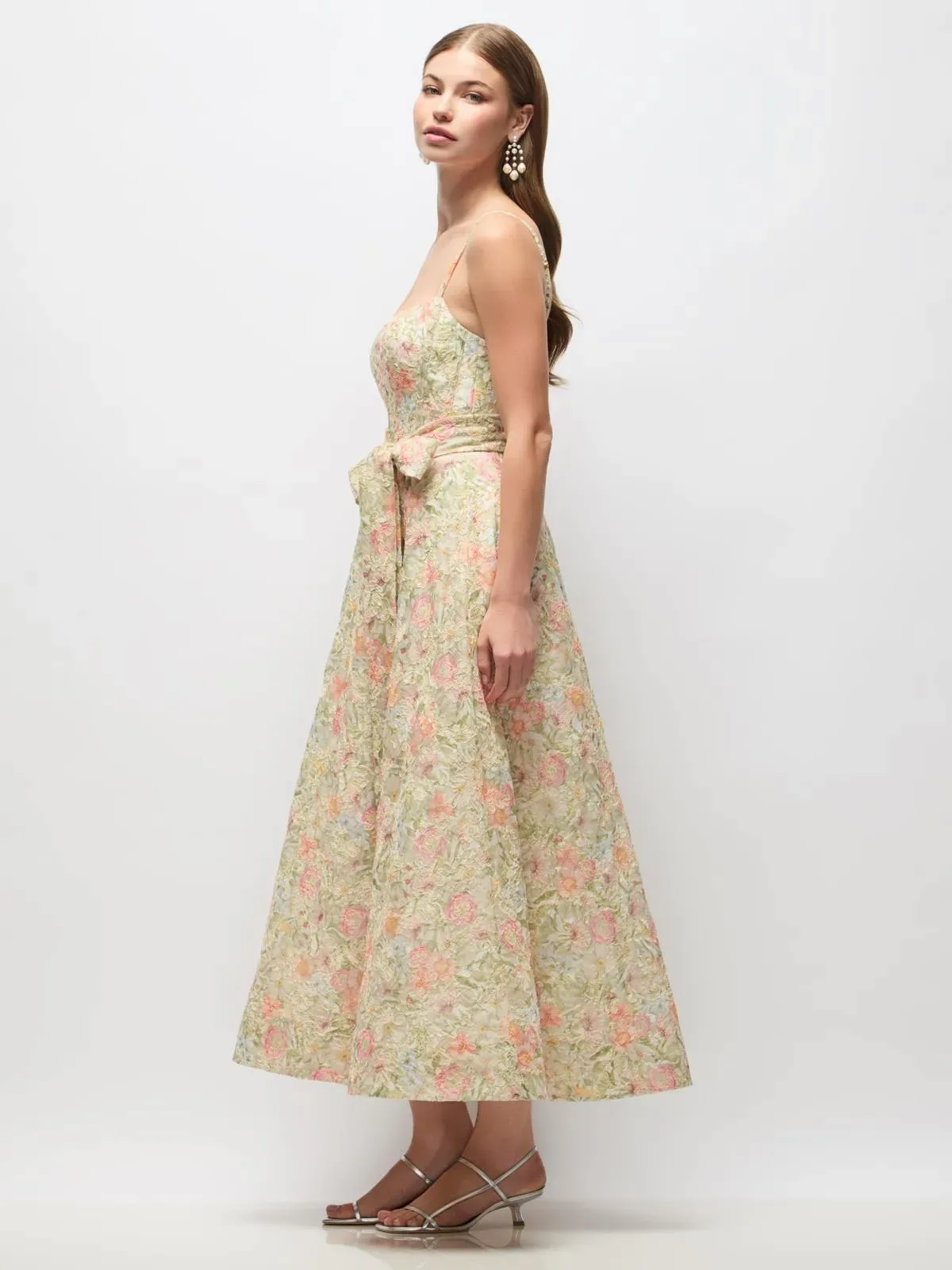 Tea length Wildflower Multi floral Re-Embroidered Voile dress with boned corset style bodice and full circle skirt. Sash at natural waist.